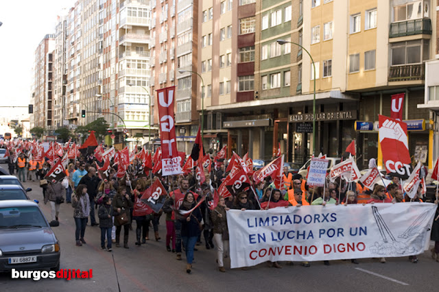 Los trabajadores y trabajadoras del sector de la Limpieza se han manifestado hoy desde Gamonal hasta el centro de Burgos para manifestar a la opinión pública su malestar e indignación ante el trato que han recibido por parte de la patronal: