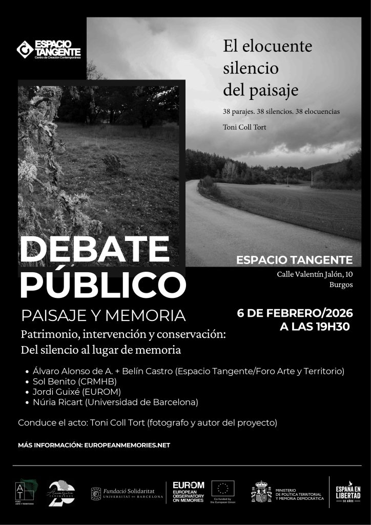 Con motivo de la exposición El elocuente silencio del paisaje, del fotógrafo y activista por la memoria democrática Toni Coll Tort, Espacio Tangente y el Foro Arte y Territorio, proponemos la realización de un acto-debate público que permita ampliar, desde distintas perspectivas, las reflexiones que atraviesan el proyecto expositivo.
