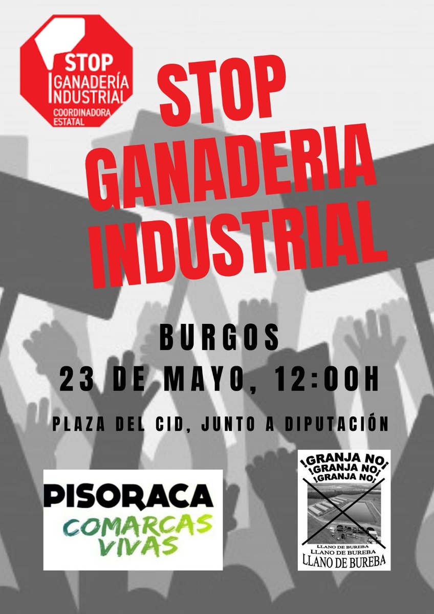 Todos los burgaleses están Convocados a manifestarse el 23 de mayo, para exigir una MORATORIA contra la ganadería industrial. Bajo el lema “MORATORIA YA, NI UNA LICENCIA MÁS”.