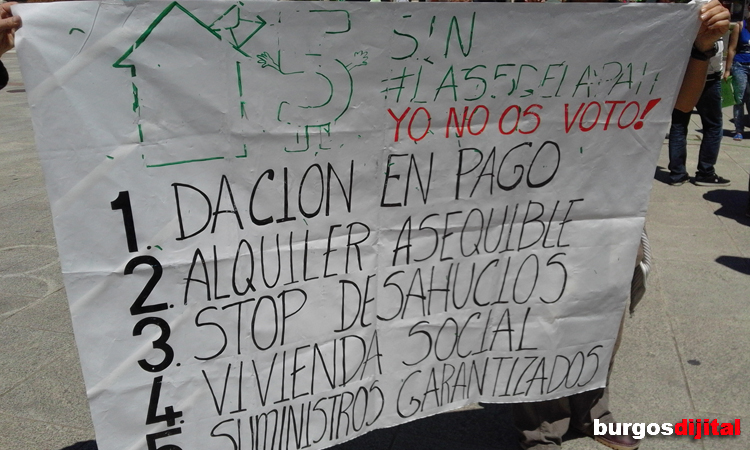 La PAH Burgos continúa con las exigencias ” al PP que deje de poner trabas a la ley catalana de medidas urgentes para afrontar la emergencia habitacional y la pobreza energética (ley 24/2015), y que por el contrario la extienda a todo el estado. Exigimos a su vez, como se hizo en la anterior campaña electoral a todos los partidos, que incluya en su programa electoral “las 5 de la PAH”. Se trata de medidas de mínimos para garantizar el derecho a una vivienda digna y poner fin a los desahucios y a la pobreza energética”, así como la Dación en Pago retroactiva, alquileres asequibles con la reforma de la LAU para dar seguridad y estabilidad, obligacion de bancos y grandes tenedores de la vivienda de ofrecer el alquiler social a las familias afectadas antes de ejecutar el desahucio, ayudas al alquiler, viviendas sociales